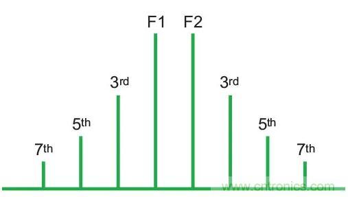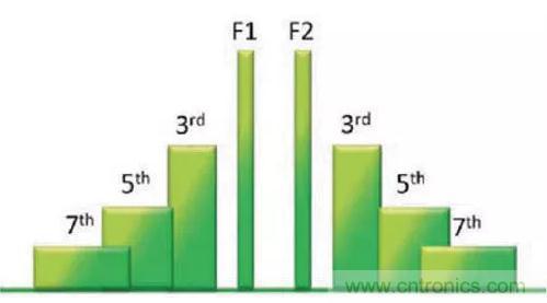 當提到PIM產品時,n + m的總和稱為產品訂單,因此如果m為2且n為1,則結果稱為三階產品(圖1)。通常情況下,三階產品最強,造成的危害最大,其次是五階和七階產品。由于訂單增加時PIM振幅變低,因此高階產品通常不足以引起直接頻率問題,但通常有助于提高相鄰噪聲基底(圖2)。