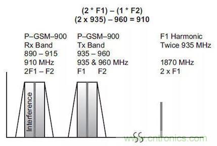 廣泛使用的900 MHz頻段的PIM示例假定兩個GSM載波,一個在935 MHz,另一個在960 MHz。在這種情況下,910 MHz三階產品位于基站接收頻段(圖4)。