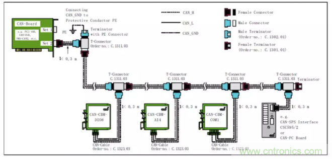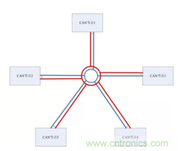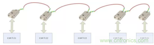 采用CANBridge中繼器,CANHub集線器等組網設備進行分支。這些設備每路都具備獨立的CAN控制器,所以可以將每段形成獨立的直線拓撲,方便施工。