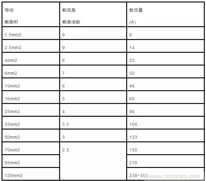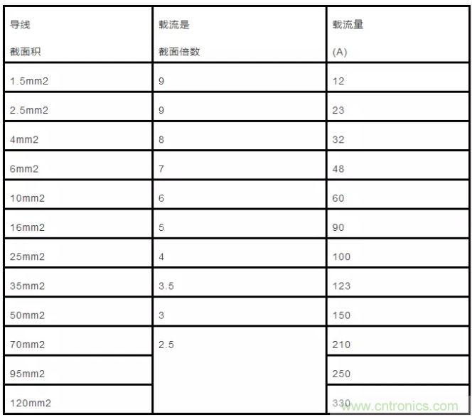 35mm”的導線載流量為截面數的3.5倍,即35×3.5=122.5(A)。從50mm’及以上的導線,其載流量與截面數之間的倍數關系變為兩個兩個線號成一組,倍數依次減0.5。即50、70mm’導線的載流量為截面數的3倍;95、120mm”導線載流量是其截面積數的2.5倍,依次類推。