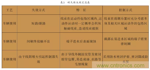 耐久性失效是一種隨著車輛使用,在中間環節形成的失效方式,是伴隨著車輛的生命周期隨機產生的,具有不可預測性。一旦失效會引起客戶對品牌的極大抱怨。此類失效多為線束在運動件包絡區域內發生,在達到一定的磨損后產生的,因此在初期不易察覺。如下表3為耐久性失效匯總表。