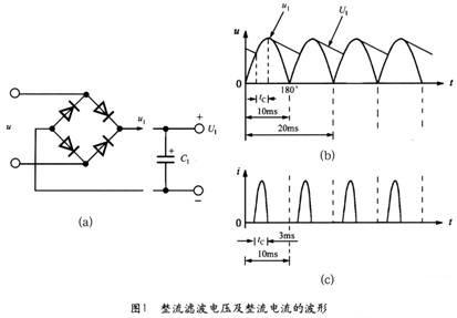 50Hz交流電壓經(jīng)過全波整流后變成脈動直流電壓u1,再通過輸入濾波電容得到直流高壓U1。在理想情況下,整流橋的導通角本應為180°(導通范圍是從 0°~180°),但由于濾波電容器C的作用,僅在接近交流峰值電壓處的很短時間內(nèi),才有輸入電流流經(jīng)過整流橋?qū)充電。50Hz交流電的半周期為 10ms,整流橋的導通時間tC≈3ms,其導通角僅為54°(導通范圍是36°~90°)。因此,整流橋?qū)嶋H通過的是窄脈沖電流。橋式整流濾波電路的原 理如圖1(a)所示,整流濾波電壓及整流電流的波形分別如圖l(b)和(c)所示。