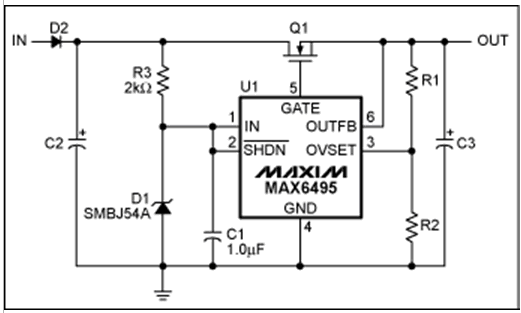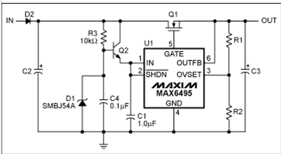 過壓保護(hù)(OVP)器件數(shù)據(jù)資料中提供的典型電路可以滿足大多數(shù)應(yīng)用的需求(圖1)。然而,有些應(yīng)用需要對(duì)基本電路進(jìn)行適當(dāng)修改。本文討論了兩種類似應(yīng)用:增大電路的最大輸入電壓,在過壓情況發(fā)生時(shí)利用輸出電容存儲(chǔ)能量。