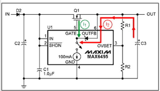 MAX6495–MAX6499/MAX6397/MAX6398通過內(nèi)部100mA的電流源(見圖4)連接到GATE輸出,以對(duì)柵極電容和輸出電容放電。電流源先對(duì)GATE放電(電流I1,綠色箭頭),直到GATE的電壓等于OUTFB電壓,然后斷開FET,電流源繼續(xù)降低GATE電壓,最后,直到內(nèi)部的箝位二極管變?yōu)檎蚱?,?duì)輸出電容放電(電流I2,紅色箭頭)。