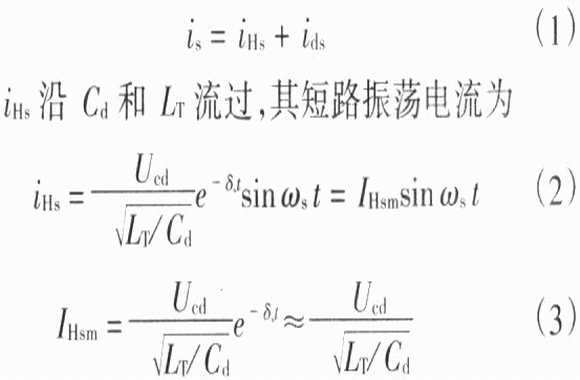 這一浪涌電流由檢測電路檢巾并使保護電路立即動作,發出過流信號,整流電路即由整流狀態向逆變電路過渡。逆變橋關斷時的等效電路如圖2(b)所示,短路電流ids移至Cd支路,Cd被充電,Cd端壓逐漸上升,短路電流下降,此后短路電流在Cd、Ld、以及吸收電路中R和C構成的回路中作振蕩衰減,直至能量消耗完為止。ids沿Ld流過,由于電路的慣性較大,電流增長不多,近似于短路前的工作電流Ido,于是浪涌電路的幅值為Ism=IHsm+Ido (4)