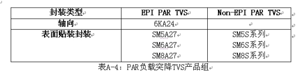 Vishay有兩種類型的汽車電子初級保護(hù)負(fù)載突降TVS:EPI PARTVS和Non-EPI PARTVS。PAR TVS的產(chǎn)品組列在表A-4當(dāng)中。