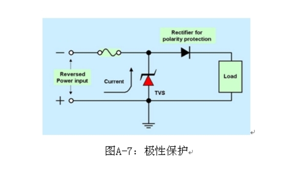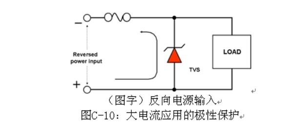大電流應(yīng)用極性保護(hù)的一種解決方案是使用高正向電流能力的整流器,或者是在電力線中使用沒有極性保護(hù)二極管的負(fù)載突降TVS,如圖C-10所示。