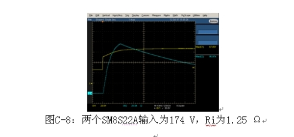 負(fù)載突降測試的波形如圖C-8所示,最大箝位電壓為174 V,Ri=1.25 Ω時為6 V±1V,流經(jīng)負(fù)載突降TVS的電流是95至100 A。這將使42 V電源網(wǎng)絡(luò)(PowerNet)半導(dǎo)體電平的精度比75 V更低,汽車中每個電子單元的次級保護(hù)器件可在這個箝位電壓與最大工作電壓之間的范圍進(jìn)行箝制。