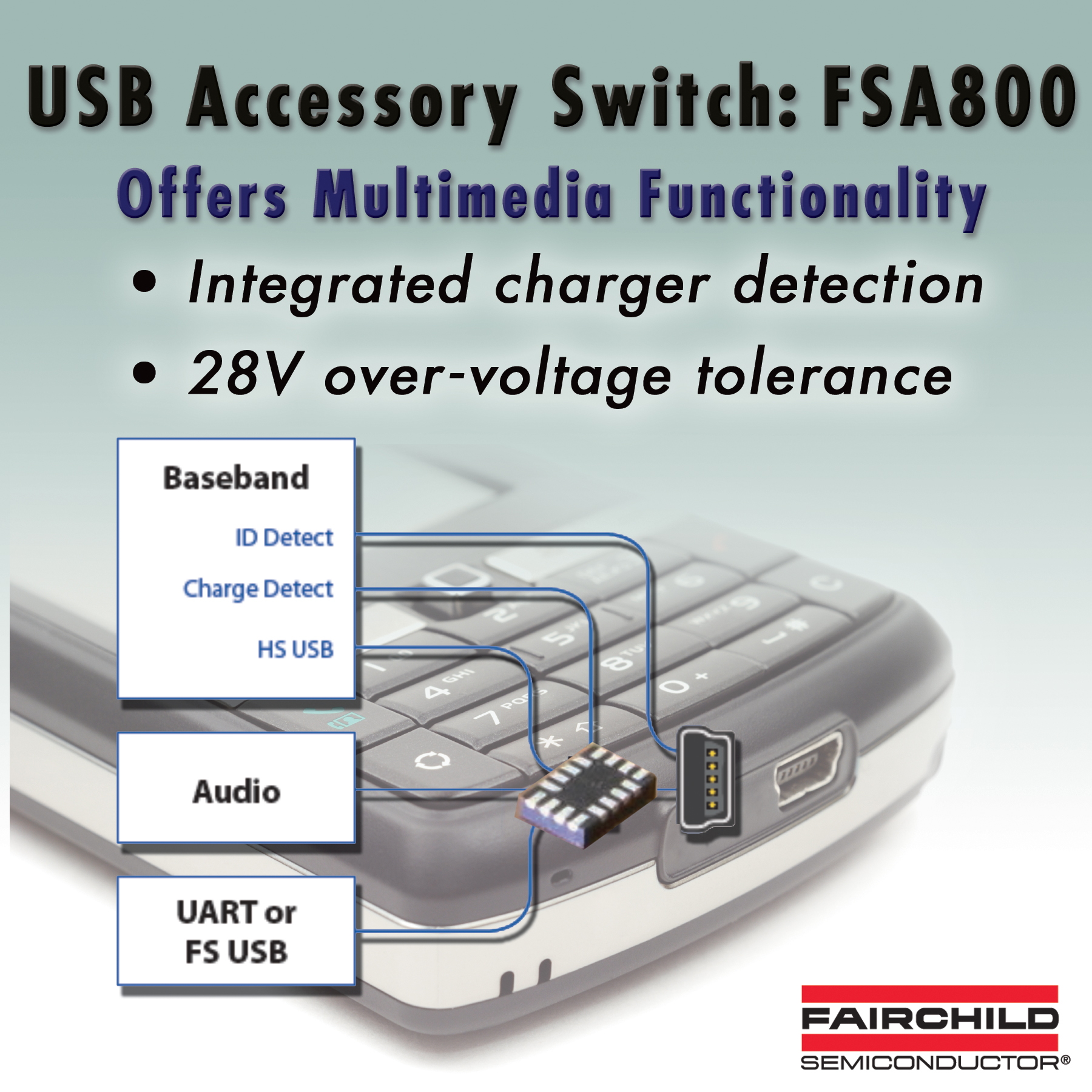 飛兆半導(dǎo)體公司 (Fairchild Semiconductor)為手機、PDA和MP3播放器設(shè)計人員提供全新USB附件開關(guān)產(chǎn)品FSA800。FSA800是業(yè)界最小的器件,將所有主要的多媒體功能集成進薄型UMLP封裝(1.8mm x 2.6mm x 0.55mm)中。它具有內(nèi)置充電檢測功能、28V的過壓容差、內(nèi)置終止電阻器,以及負(fù)擺幅功能。通過在緊湊型封裝中集成了多種功能,可以簡化便攜設(shè)計并減少外部元件數(shù)目。