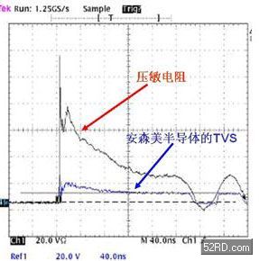 圖3的屏幕截圖就是這樣一個范例。從圖中可以看出,安森美半導體的TVS元件可以迅速將ESD應力降低,即從8kV靜電電壓鉗位到5至6V的水平;但壓敏電阻的曲線則下降得很慢,而且無法降到很低的水平。該曲線表明,TVS器件的恢復時間非常短,經過TVS器件泄漏到后面電路的能量也非常少,特別適合于便攜式設備的應用。