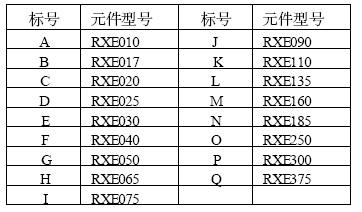 RXE系列PolySwitch元件20℃時(shí)的動(dòng)作保護(hù)特性曲線見圖1。其中橫坐標(biāo)表示故障電流,單位為安培,縱坐標(biāo)表示動(dòng)作時(shí)間,單位為秒。兩個(gè)坐標(biāo)軸均為對(duì)數(shù)坐標(biāo)。圖中每一條曲線對(duì)應(yīng)一個(gè)型號(hào)的元件,構(gòu)成該系列元件的動(dòng)作保護(hù)特性曲線簇。表2為圖1中曲線標(biāo)號(hào)與元件型號(hào)的對(duì)照表。