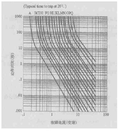 圖1 RXE系列元件20℃時(shí)的動(dòng)作保護(hù)特性曲線