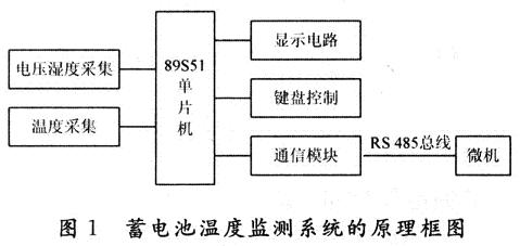 蓄電池溫度監測系統的原理框圖如圖1所示。主要由電壓、溫濕度采集、溫度采集、89S51單片機、鍵盤控制模塊、顯示電路模塊、通信模塊組成。該系統能完成6組或6組以上通信電池的溫度測量、1路機房環境測量(溫度、濕度測量)、2路直流電壓和2路交流電壓測量,傳輸數據距離大于200m。