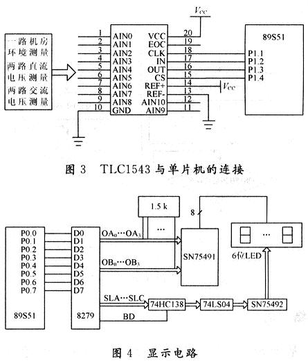 直流電壓、交流電壓以及機房溫濕度的測量選用TLC1543,TLC1543為10位11通道的A/D轉換器,與單片機的連接如圖3所示。機房環境測量(溫度、濕度)采用JWS溫濕度變送器,輸出信號為標準0~5V直流電壓信號;直流電壓的數據采集經電阻分壓后直接送至A/D轉換器,交流電壓的采集經分壓整流后也直接送至A/D轉換器。