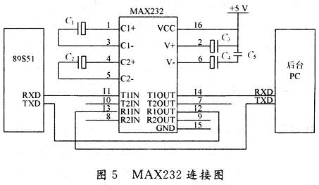為了滿足數據傳輸距離大于200m,通信采用75LBC180全雙工485芯片,單片機通信電平和計算機電平的轉換采用MAX232完成,如圖5所示。MAX232芯片是專為電腦的RS232標準串口設計的接口電路,使用+5V單電源供電。另外。RS232到RS485的轉換可采用專用的轉換器,如BOK-60或ATC-160A無源轉換器。
