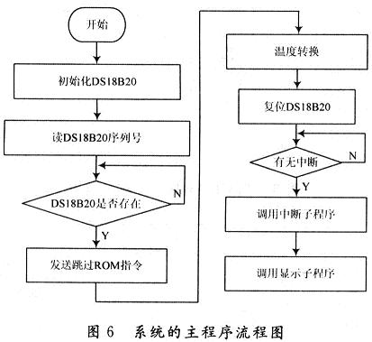 蓄電池溫度監測系統的軟件設計主要包括主程序、外部中斷子程序、顯示子程序等。圖6是該系統的主程序流程圖。用于完成對DS18B20的調用、中斷管理、測量溫度值的計算及溫度值的顯示等功能。主機89S51首先復位脈沖使信號線上所有的DS18B20芯片都被復位,接著發送跳過ROM操作命令,激活在線的所有DS18B20,然后系統轉人中斷處理流程,完成溫度轉換,讀取等工作。外部中斷子程序完成對溫度測量數據的讀取,顯示子程序完成液晶顯示器的初始化及顯示溫度值。