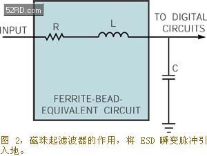 [page]一種可在電路輸入級使用的簡單的ESD瞬變抑制技術,就是將一個磁珠串在輸入引線上,并在輸入引線和地之間接一只容量很小的電容器。圖2示出了磁珠的等效電路。輸入端的LC電路起濾波器的作用,將ESD瞬變的能量分流入地。當使用瞬變抑制二極管保護任何輸入端或輸出端時,要使瞬變抑制器盡量靠近這些端子。很長的導線和電路板印制線都有寄生電感,當ESD瞬變脈沖進入電路時,寄生電感就會產生電壓過沖與振鈴問題。