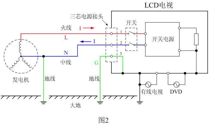 當中線和地線互相接錯時,相當于圖2中電視機的三芯插頭、座的2號線與3號線互相交換了位置。圖3就是電網輸電線的中線和地線互相接錯時,會引起三芯電源插頭的LCD平板電視機發生起火故障的工作原理圖。