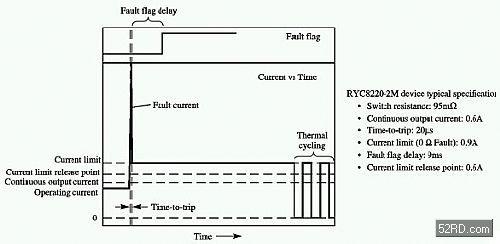 動作時間是指保護電源開關器件啟動其電流限制回路的速度。硅元件所具有的極快的動作時間使其成為功率限制應用中的最佳選擇。與PPTC元件不同之處在于其動作后的電流值能夠保持在相當高的水準,并由電流限制的設定值來決定。電流限制設定值是指硅元件一旦動作后將電流所限制到的標準,其數值根據故障狀態的嚴重程度來變化,通常定義為故障電阻的函數。對于小功率的應用,電流限制值應該盡量設低。