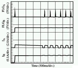 PowerSwitch電源開關元件檢測到了通道A的故障,并開始限制電流。而只有在通道A,PowerSwitch將真正地開始ON/OFF循環週期直至故障現象消失。而通道B上的連續電流處于技術規范之內,其工作保持不受影響。