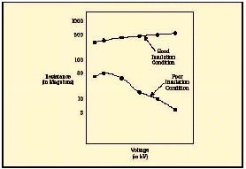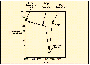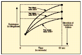 [page]在短時測試中,兆歐表被直接跨接在被測設(shè)備上,施加大約60秒的測試電壓。為了在大約一分鐘的時間內(nèi)使絕緣值讀數(shù)達(dá)到穩(wěn)定,應(yīng)該只對低容性的設(shè)備進(jìn)行該項測試。基本的連接步驟和驗證測試時相同,所施加的電壓按DC測試電壓公式進(jìn)行計算。當(dāng)測試好的設(shè)備時,您會注意到,隨電容容量和吸收電流的降低,絕緣阻抗值會穩(wěn)定上升。由于溫度和濕度會影響測試結(jié)果,應(yīng)該在標(biāo)準(zhǔn)溫度(大約20?C/68?F)下、露點之上的環(huán)境下進(jìn)行測試。 當(dāng)設(shè)備的額定值等于或小于1000伏特時,絕緣讀數(shù)應(yīng)該為1MΩ或更高。當(dāng)設(shè)備額定值高于1000伏特時,理想的阻抗應(yīng)該為每1000伏特上升1MΩ。所測量的絕緣阻抗值通常會略低于以前記錄的值,其下降的趨勢規(guī)律如圖6所示。絕緣值下降的斜率是絕緣材料老化程度的正常信號。陡峭的下降斜率是絕緣失效或可能出現(xiàn)故障的先兆。