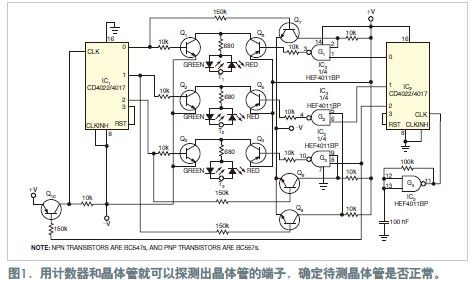 電路使用兩只CD4022或CD4017計數(shù)器IC1和IC2;一只單門方波振蕩器G4;以及一個CD4011四與非門,G1至G3。每個測試端子串接一對LED,用于指示電流的方向。LED的顏色直接表示出晶體管的結(jié)端。