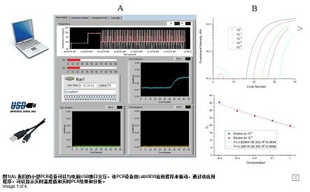 利用該系統(tǒng)同時運行包含預加載PCR反應物的三個聚合物,從抽樣到結果所花費時間不到一小時,并且允許采用大量生物的多樣性。利用熱敏電阻的實時溫度反饋,一個內部比例積分微分(PID)芯片來處理溫度控制。該控制器由一個補償器,輸出裝置和傳感器反饋信號組成,反饋信號對于控制加熱器輸出功率,以及保持溫度是很必要的。使用LabVIEW軟件,我們對圖形用戶接口進行編程,以顯示實時溫度,設置溫度,并且顯示來自三個通道的實時PCR結果 (如圖1A所示)。
