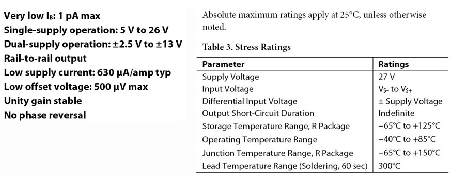 圖2:AD8625/AD8626/AD8627運算放大器的"主要特性"和絕對最大值規格