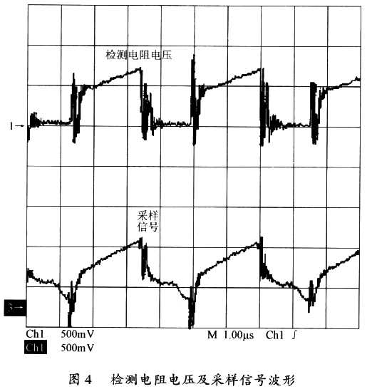 圖4給出了UC3842檢測電阻的電壓波形和采樣信號波形。從圖4中可以看出,經過改進后的電路,其采樣信號的波形緊緊跟隨檢測電阻的電壓波形,沒有出現非常大的尖峰電壓。因此,該電路能有效避免因變壓器漏感等異常干擾引起的電源誤操作的問題,也能有效避免因電源占空比過大而引起的系統不穩定的問題。
