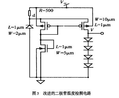 假設在總電路中標準的參考電壓為2. 0 V。則二極管溫度檢測電路的參數要調節到( V T + + V T - ) / 2= 2. 0 V。調節的方法很多,3 個用作鏡像電流源的MOS管的尺寸可以很方便的調節,MOS 管尺寸改變則流過二極管的電流就會改變,從而引起上下跳變點電壓的改變。甚至還可以調節二極管,比如去掉1 個二極管,就用3 個二極管來做溫度檢測。如圖3 所示的尺寸時,50 ℃時為2. 16 V ,120 ℃時為1. 535 V ,即V T + = 1. 535 V , V T - = 2. 16 V。則( V T + + V T - ) / 2= 1. 85 V ,不到2. 0 V。最方便的調節方法就是放大二極管前面1 個NMOS 管的尺寸。尺寸越大則跳變點電壓就越高。當然也可以調節另外的2 個MOS 管的尺寸??傊沟? V T + + V T - ) / 2 = 2. 0 V。
