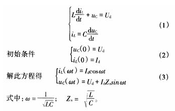 假設逆變關斷時濾波電感中的電流全部從電容C中流過,同時整流器繼續輸出電壓Ud。圖6給出了等效電路,L與C串聯諧振,由于整流橋電流只能單向流通,所以振蕩到T/4時結束。