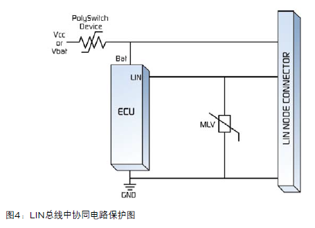 圖4為協同的電路保護圖,顯示出一個設置在功率輸入的可復位PolySwitch器件如何在電源輸入端保護ECU和LIN節點連接器免受過電流情況的損傷,以及一個MLV(多層電壓敏電阻器)如何為車載網絡應用提供所需的高電流處理和能量吸收的過電壓保護。