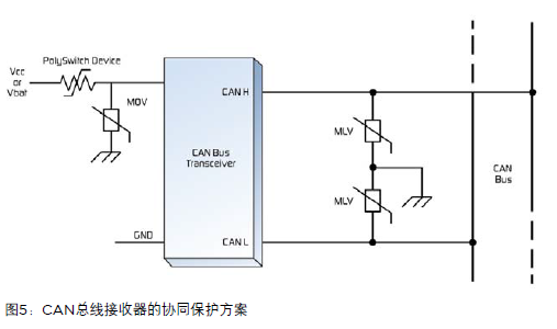 圖5顯示了如何在電源輸入端應用可復位PolySwitch設備和MOV(金屬氧化電壓敏電阻器)從而避免因車載供電系統中心的浪涌電流和電壓異常而產生的損傷。