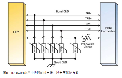 CCP端口包括一個車載等級1394b的物理層和連接器,允許用戶將便攜式設備連接到車輛,通過IDB-1394接口獲取音頻和視頻服務。CCP端口采用標準連接器,專為該設備供電而設計。其供電特點無需額外電池或單獨電源線,讓客戶無需為插入的設備是否已經通電而擔憂。IDB-1394為高速多媒體應用而設計,總線速度高達800Mbps且要求通電端口具有可復位過電流保護。如圖8所示,PolySwitch設備可用于在出現故障時限制危險高電流。MLV可安裝到供電總線上避免ESD浪涌和過電壓瞬態所產生的損害。低電容PESD設備或PESD陣列也可安裝在數據線路上幫助提供ESD保護。