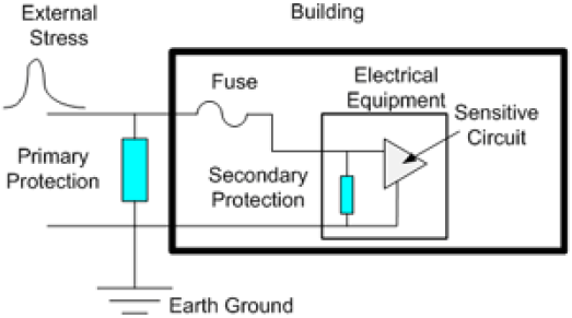 初級和次級保護的應用非常普遍。這個概念在電信產(chǎn)業(yè)中用于閃電和浪涌保護,也在先進集成電路技術(shù)中做靜電放電(ESD)保護。初級的保護元件較貼近應力源,主要目的是用于承受大部分的電流應力,而次級保護元件則非常貼近敏感的電路元件,在最需要的地方提供保護。