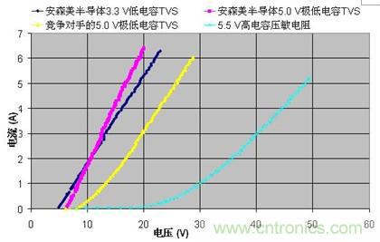 結合ESD脈沖測試和TLP測試,我們可以得出結論,在不同ESD保護元件中,TVS元件,特別是安森美半導體的TVS元件的大電流導電率極佳,且在重復應力條件下仍能維持優異性能,不存在壓敏電阻或聚合物那樣的使用增多后會出現性能下降的問題;至于其在電容方面的不足,也隨著新的低電容設計的出現,而消除了早前的大電容問題。