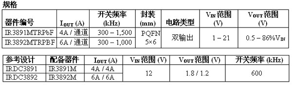 全新雙輸出器件對5V到12V輸入、1V到21V輸入 (使用5V外偏置) 單電源軌操作進(jìn)行了優(yōu)化。IR3891和IR3892采用了纖巧的5×6mm PQFN封裝,在165mm2的小巧占位面積內(nèi),分別為需要4A/通道或者6A/通道的應(yīng)用帶來極為緊湊的解決方案。