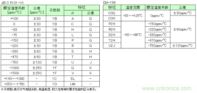 EIA標(biāo)準(zhǔn)中規(guī)定了0ppm/℃~-750ppm/℃范圍內(nèi)的數(shù)種靜電容量溫度系數(shù)。關(guān)于代表性材料的溫度特性,如下所示(參考圖2)。適用的JIS及EIA標(biāo)準(zhǔn)的摘錄,如表1所示。