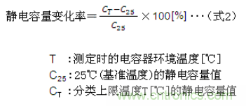 (2) 另一種是在公共標(biāo)準(zhǔn)中被歸類于Class2(種類2)的高介電常數(shù)獨(dú)石陶瓷電容器,使用了鈦酸鋇系的介電質(zhì)材料,其靜電容量值對(duì)溫度呈現(xiàn)出不規(guī)則的變化。 因此,靜電容量-溫度特性的標(biāo)準(zhǔn)值是針對(duì)基準(zhǔn)溫度(此處以25℃為基準(zhǔn))的靜電容量值C25,通過(guò)適用溫度范圍內(nèi)的靜電容量變化率的最大值與最小值進(jìn)行規(guī) 定。(參照式2)。