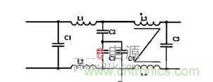 EMI濾波技術是一種抑制尖脈沖干擾的有效措施,可以濾除多種原因產生的傳導干擾。圖3是一種由電容、電感組成的EMI濾波器,接在開關電源的輸入端。電路中,C1、C5是高頻旁路電容, 用于濾除兩輸入電源線間的差模干擾;L1與C2、C4;L2與C3、C4組成共模干擾濾波環節,用于濾除電源線與地之間非對稱的共模干擾;L3、L4的初次級匝數相等、極性相反,交流電流在磁芯中產生的磁通相反,因而可有效地抑制共模干擾。測試表明,只要適當選擇元器件的參數,便可較好地抑制開關電源產生的傳導干擾。