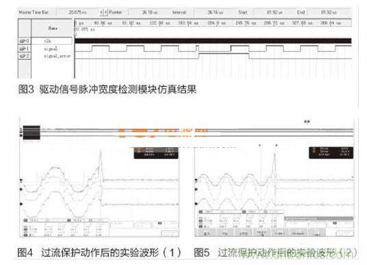 電路實現:在CPLD中設置預先設定的計數門限值,即驅動信號高電平或者低電平持續的最大計數值;對輸入的驅動信號的高電平或者低電平持續計數,將采樣得到的單位計數值與預置的門限計數值進行比較,如果計數值小于或者大于預先設置的值,則檢測模塊輸出閉鎖信號,切斷驅動信號輸出模塊的信號輸出,完成驅動信號的高電平脈沖寬度檢測;同時,模塊將驅動信號進行反相邏輯轉換,然后再檢測轉換后形成的高電平脈沖寬度,這樣,實現驅動信號的低電平的脈沖寬度檢測。