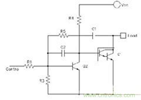 圖中R1作用是Q2的基極限流;R3作用是泄放掉關斷狀態時基極電荷,讓Q2在低電平時保持截止狀態;R4作用是Q2的集電極限流以及Q1的基極限流;電容C2是加速電容,加速Q2的開關速度,降低Q2管耗,從而延長Q2壽命;R5和C1是作為輸出反饋給Q2的基極,作用同樣為加速Q2的開關速度,延長Q2的壽命以及電路整體的性能,此為正反饋。