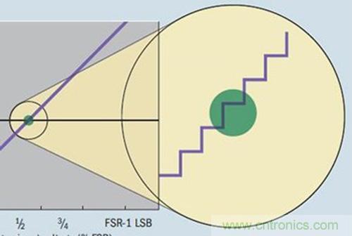 總之,沒有能為A/D轉(zhuǎn)換器計(jì)算TUE最大值的確定公式,因?yàn)樵撜`差取決于A/D轉(zhuǎn)換器工作時(shí)的輸入范圍。如果系統(tǒng)不需要采用A/D轉(zhuǎn)換器的整個(gè)輸入范圍,那么工程師可通過使該器件遠(yuǎn)離其傳遞函數(shù)的端點(diǎn)運(yùn)行來最大限度地減小TUE。