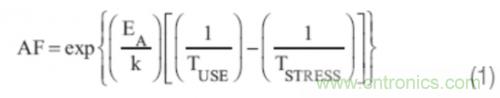 JEDEC和AEC標(biāo)準(zhǔn)均基于健全完善的基本原理,不過技術(shù)上比較落后。雖然通過硅產(chǎn)品質(zhì)量鑒定是一件有價(jià)值的、里程碑式的重大事件,但是用戶需要一個(gè)能夠在實(shí)際使用條件下,在所需的使用壽命內(nèi),比如說10年,以低故障率持續(xù)運(yùn)行的產(chǎn)品。因此,推出FRAM、成比例CMOS、GaN等新技術(shù)的公司需要了解這些標(biāo)準(zhǔn)的基本原理。在JEDEC質(zhì)量鑒定方法體系中,主要的促進(jìn)要素是溫度。根據(jù)方程式eq.(1)計(jì)算出加速因子 (AF),在這里EA是激活能量,而k是玻爾茲曼常數(shù)。