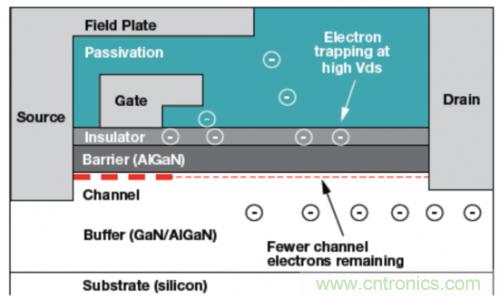 圖1:一個(gè)GaN器件的電路橫截面顯示被陷獲的電子如何通過減少通道層中的電子數(shù)量來增加Rds導(dǎo)通電阻。