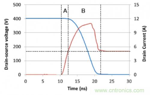圖3:針對(duì)一個(gè)硬開關(guān)變換的接通轉(zhuǎn)換。
