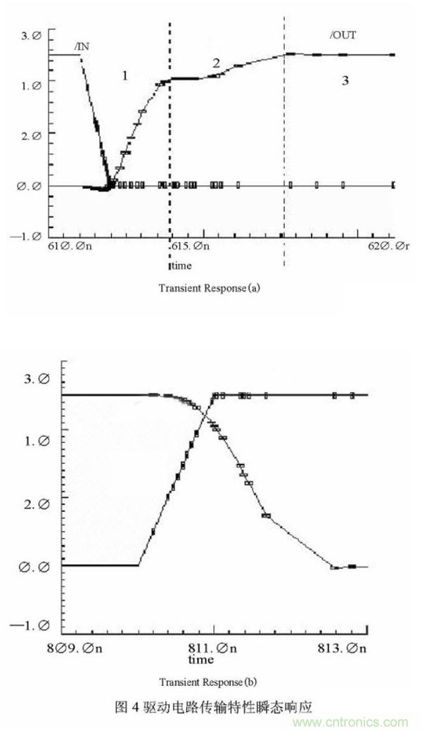 驅動電路的傳輸特性瞬態響應在圖4中給出。其中(a)為上升沿瞬態響應,(b)為下降沿瞬態響應。從圖4中可以看出,驅動電路上升沿明顯分為了三個部分,分別對應三個上拉驅動管起主導作用的時期。1階段為Q1、N4共同作用,輸出電壓迅速抬升,2階段為N4起主導作,使輸出電平達到VDD,3階段為P5起主導作用,維持輸出高電平為VDD。而且還可以縮短上升時間,下降時間滿足工作頻率在兆赫茲級以上的要求。