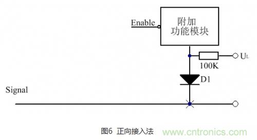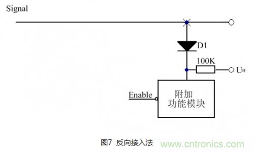 反向接入方法如圖7所示,與正向接入不同的是,二極管的正極接到信號線上,UH接至高電平。