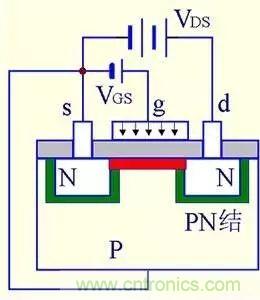 (1) VGS=0時(shí),不管VDS極性如何,其中總有一個(gè)PN結(jié)反偏,所以不存在導(dǎo)電溝道。