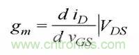 在轉(zhuǎn)移特性曲線上,gm 是曲線在某點(diǎn)上的斜率,也可由iD的表達(dá)式求導(dǎo)得出,單位為 S 或 mS。